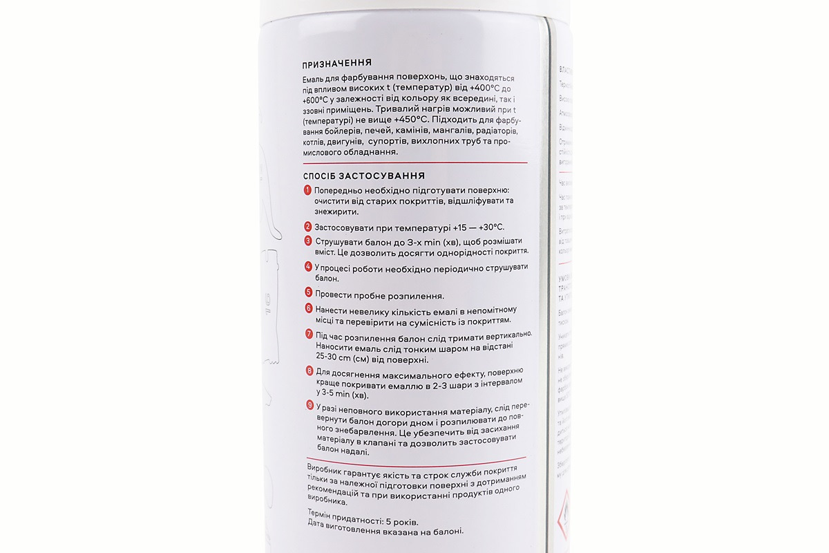 Рекомендація до застосування: фарбування виробів та обладнання, що піддаються дії високих температур. Фарбувальні роботи можна здійснювати як усередині приміщення, так і зовні. Сумісність з більшістю матеріалів, а також із раніше пофарбованими поверхнями.