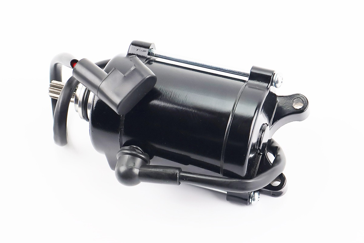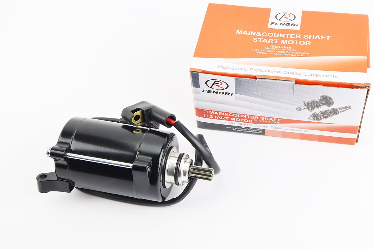 Це стартер (електростартер) у зборі - готовий до встановлення електричний механізм запуску двигуна для мотоциклів/двигунів серії Loncin JL200‑68A та сумісних китайських моделей з 9‑шліцевою шестернею (вал приводу). Товар виробляється під брендом FENGRI, має чорне покриття корпусу та призначений для забезпечення надійного запуску 4‑тактного двигуна через кнопку стартера.