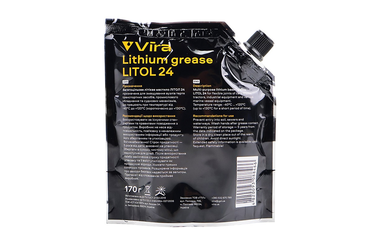 Мастило універсальне VIRA Літол-24 пластичне літієве коричневе виготовлено за спеціальною формулою, до складу якої входять такі компоненти: суміш нафтових олив, загущених літієвим милом, функціональні присадки та 12-оксистеаринова кислота. Такий склад сприяє появі у готового продукту наступних властивостей: