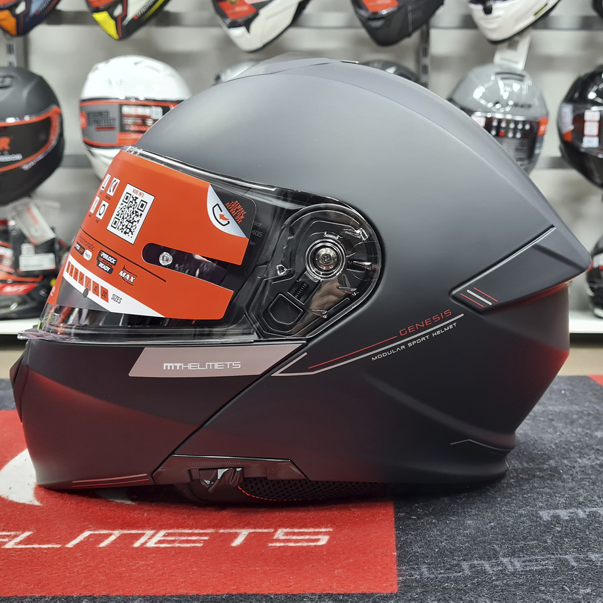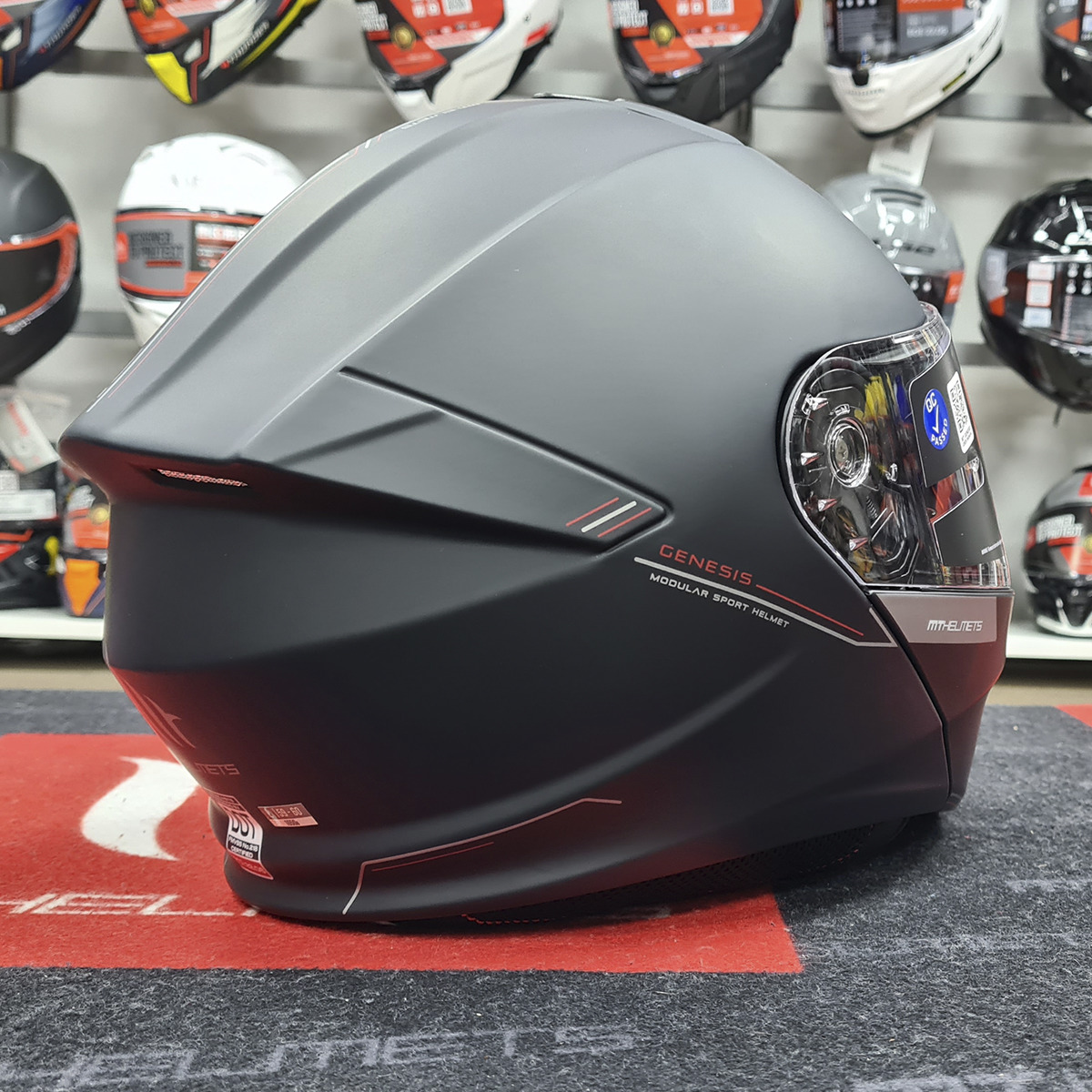 GENESIS SV містить усі функції модульного шолома з новим сертифікатом безпеки ЕСЕ2206 за конкурентоспроможною ціною. Підборіддя, що відкривається: оснащено автоматичною системою закриття візора при відкриванні підборіддя. Висувні сонцезахисні окуляри з автоматичним засувом на одній кнопці. Підготовка під встановлення гарнітури, пінлока.