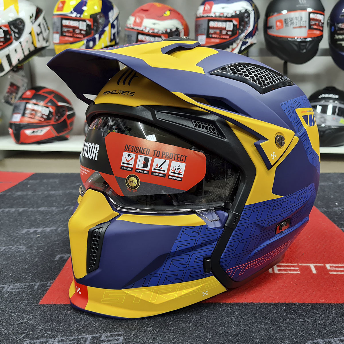 Модель творена на основі тріального мотошолома District від MT Helmets. Шолом оснащений з'ємним козирком та підборіддям, роль візора виконують сонцезахисні окуляри. Модель призначена для невеликих прохватів по місту за хорошої погоди на крутому кафешнику або стріті з футуристичним дизайном. Цей шолом, як і інші конкуренти цього класу, не дасть Вам високого ступеня захисту та комфорту. Він створений для інших цілей-для понтів, якщо хочете. Тихі, безпечні та комфортні - це модуляри та інтеграли! Не слухайте продавців які Вам втиратимуть що це універсальний шолом!