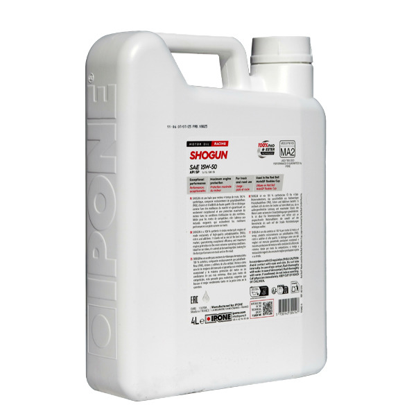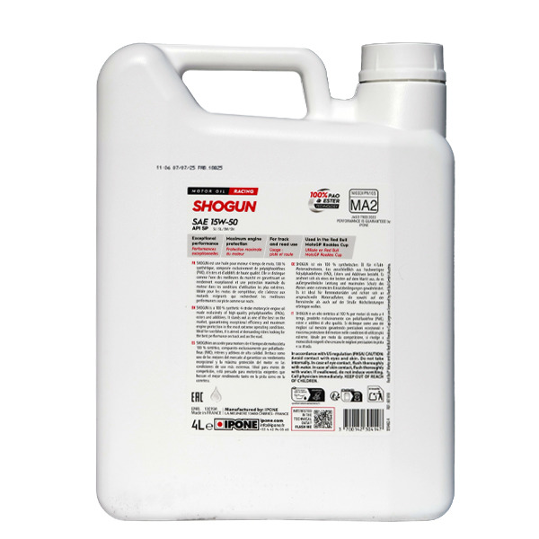 Синтетична основа масла IPONE Shogun 15W50 складається з поліальфаолефінів (ПАО) та складних ефірів (естерів). Останні, зокрема, покращують розчинення присадок та здатність масла ніби прилипати до металевої поверхні, утворюючі мікроплівку. Завдяки цьому моторне масло не стікає повністю з поверхонь деталей двигуна під час простою мотоцикла. І в момент запуску двигун змащується з першої секунди роботи.
