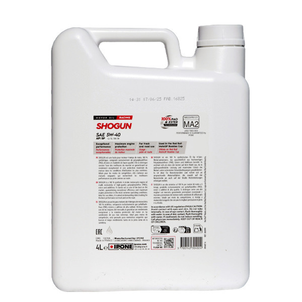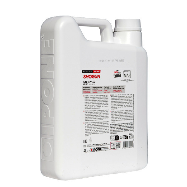 Масло Shogun 5W40 має формулу на основі з поліальфаолефінів (ПАО) та складних ефірів (естерів). Таке базове масло разом з високоефективними присадками дозволяє гонщику повністю концентруватись на свої головній місії – шляху до перемоги, в той час як захист двигуна та коробки передач бере на себе найбільш досконале масло IPONE.