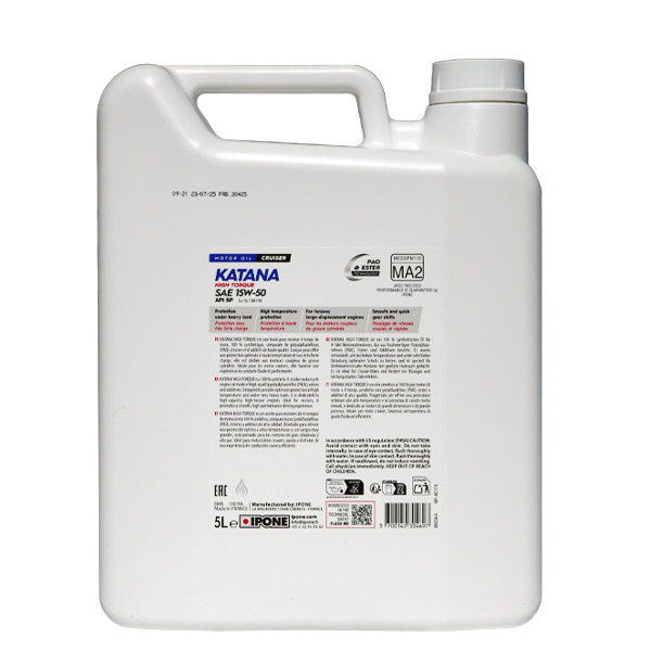 Katana High Torque 15W50 – новий продукт із преміальної серії Катана для мотоциклів з великим об’ємом циліндрів та високим крутним моментом. З англійської high torque означає високий крутний момент. Які і всі інші Катани, це 100% синтетичне масло зі складними ефірами та спеціальними присадками для м’якої роботи коробки передач.
