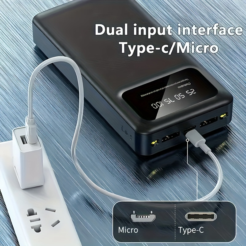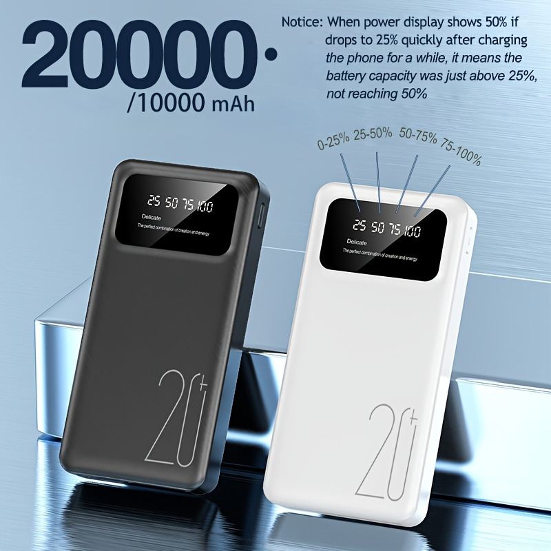 Портативний Power Bank ємністю 20000 mAh — надійний зовнішній акумулятор для щоденного використання. Оснащений подвійним LED-підсвічуванням та великим LED-індикатором рівня заряду, що дозволяє легко контролювати стан батареї. Має два варіанти входу та виходу, забезпечуючи зручне заряджання різних пристроїв.