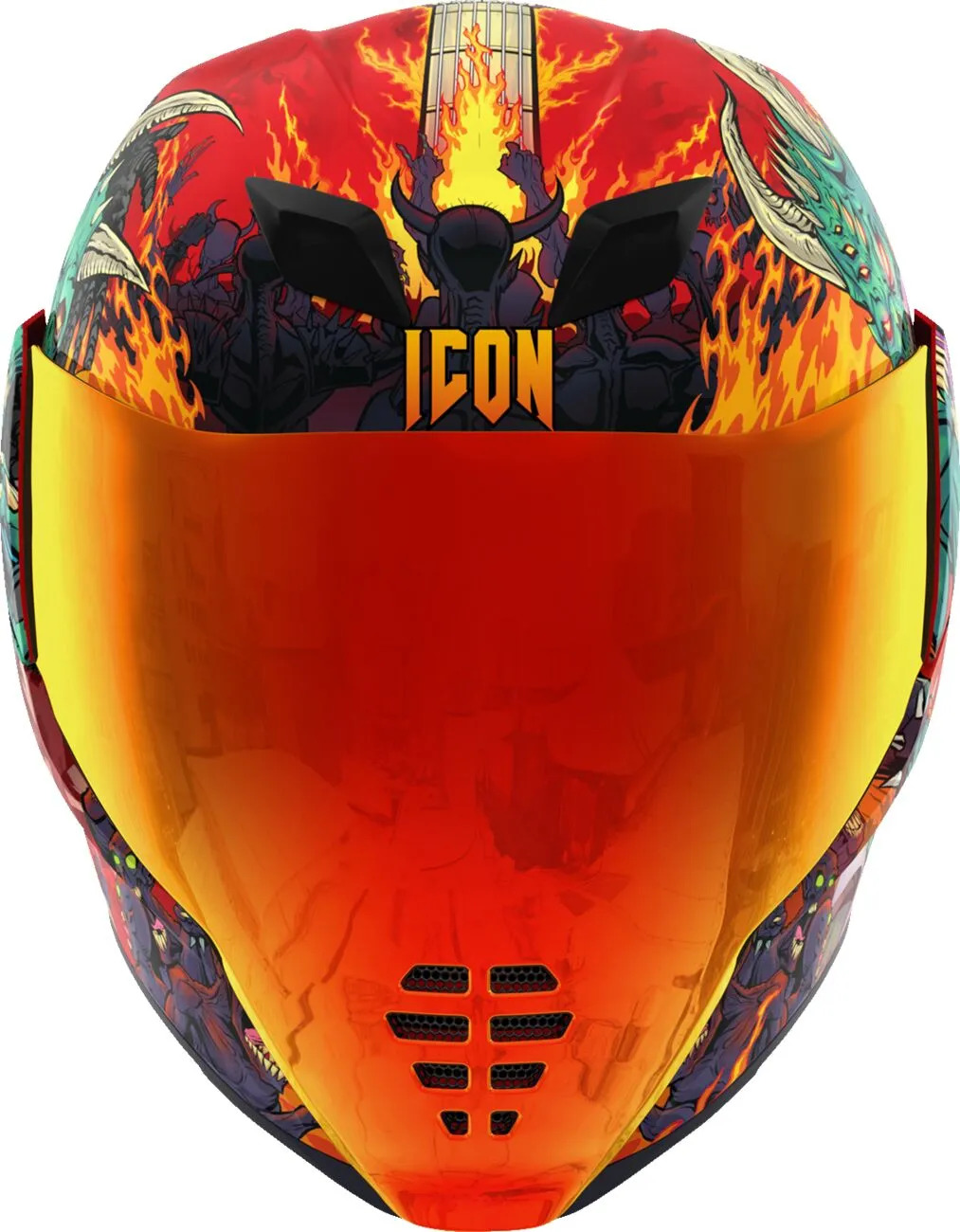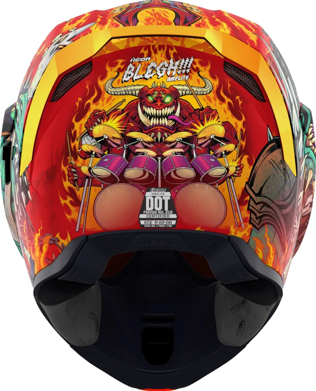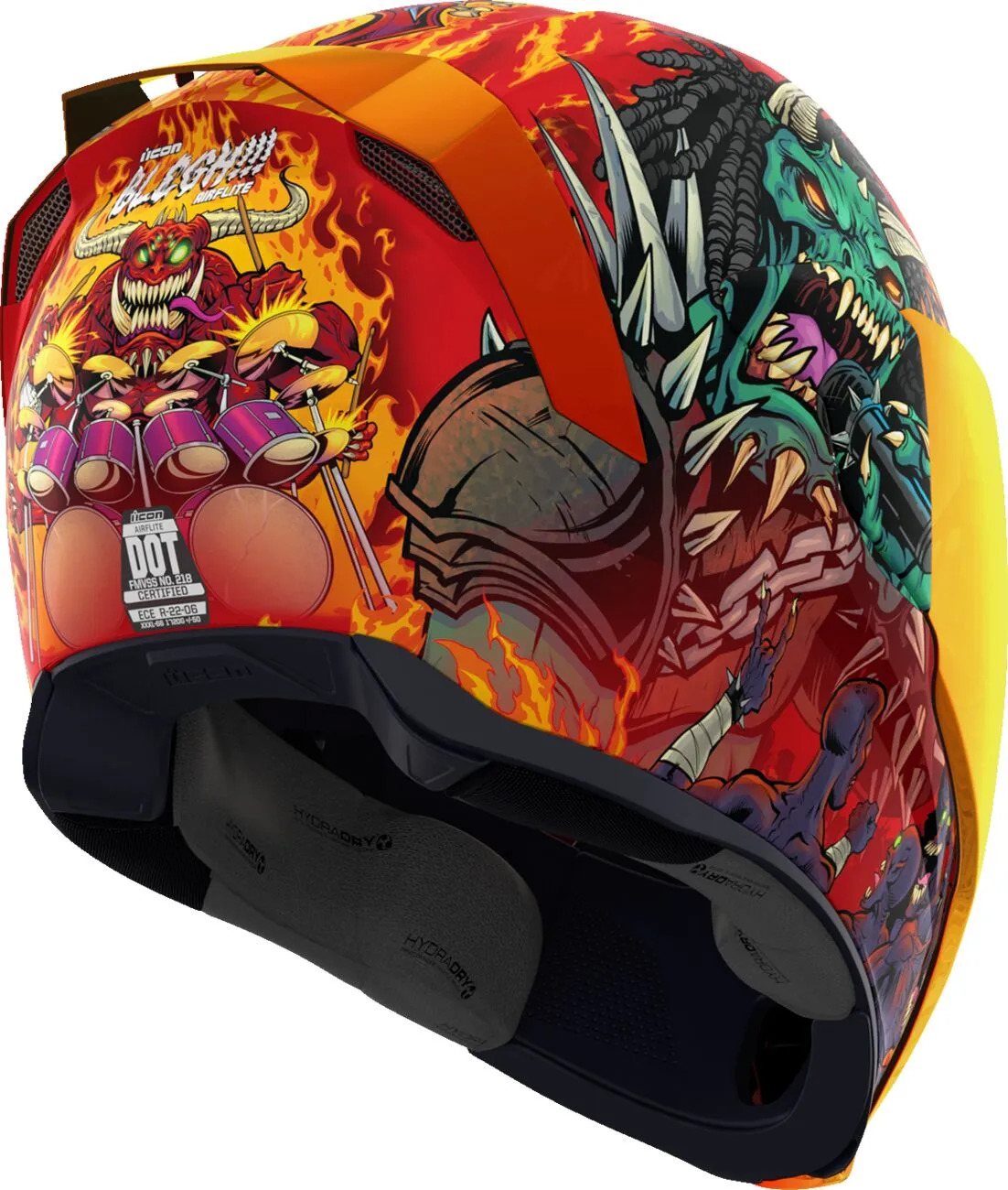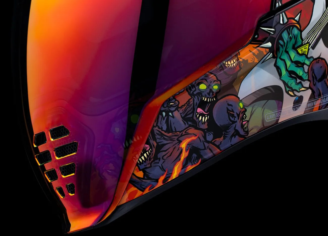 Знімний литий дефлектор дихання та шторка для підборіддя з міцного полікарбонатного корпусу. Захист від запотівання Dropshield™ з зовнішнім вимикачем і швидкозмінний Fliteshield™ з боковими пластинами. Втоплена двоканальна система охолодження Supervent із збільшеними впускними й випускними отворами. Знімна вологовідвідна підкладка Hydradry™. Козирок Dropshield™ використовується лише при повністю закритому лицьовому щитку. Світиться в темряві. Внутрішні кишені для динаміків сумісні з Bluetooth-пристроєм RAU від ICON. У комплекті прозорий і RST Sunset Fliteshield™ без запотівання.