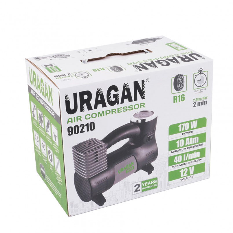 Автокомпресор Uragan 90210 працює від 12 В мережі прикурювача автомобіля. Споживана однопоршневим двигуном потужність становить 170 ВТ, а максимальний споживаний струм - 14 А. Продуктивність при тиску в 0 бар дорівнює 40 літрам за хвилину. Максимально допустимий тиск - 10 атмосфер. Час безперервної роботи представленої моделі становить 15 хвилин.