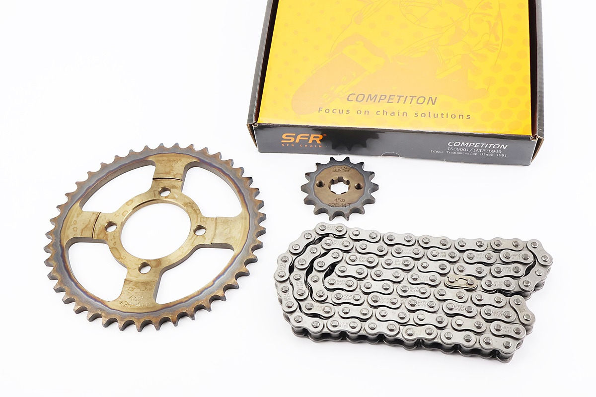 Це готовий комплект приводу ланцюгом із ведучої зірки, веденої зірки та ланцюга, призначений для легких мотоциклів об’ємом ~125 см³ (часто ZS125J або подібних моделей). Такі комплекти встановлюються замість зношених деталей приводу або при технічному обслуговуванні трансмісії.